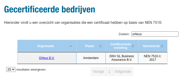 De NEN7510:2017-certificering van Orfeus is opvraagbaar via het NEN-register op: https://www.nen.nl/Normontwikkeling/Certificaten/Schemabeheer/Register-NEN-7510.htm